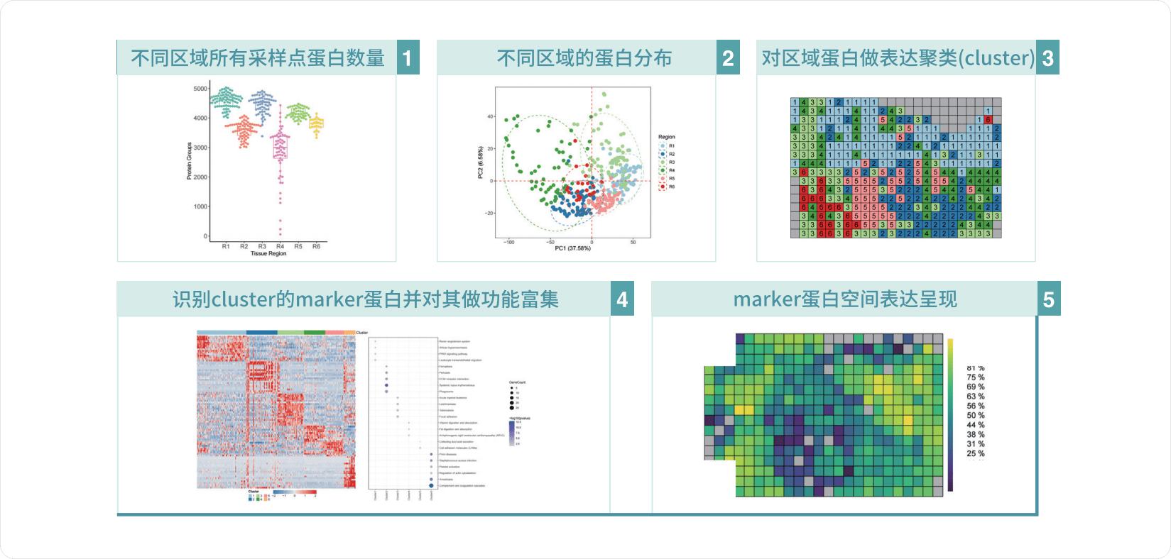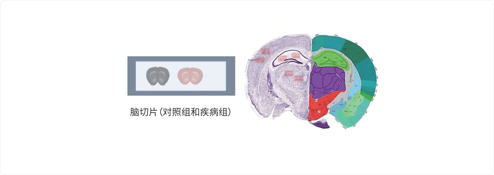 对野生型和疾病模型小鼠的脑切片进行比较,分别取6个感兴趣的脑区域,每个区域切割50-80个采样点(100x100um2),通过质谱蛋白质组,可以比较不同组别、不同脑区、以及区域内部的空间表达差异。