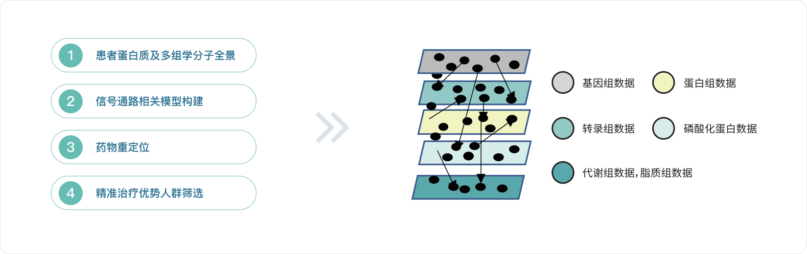 多组学发挥结合多种组学数据进行疾病研究的优势,在不同的组学层面根据检测到的潜在的相互作用或相关性,以整合多种全向性数据来理解疾病。